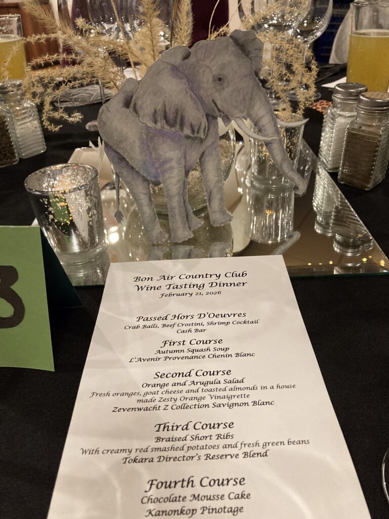 Saturday, February 21st. Wonderful South African wines with great food, lovely company, and a picture safari.
